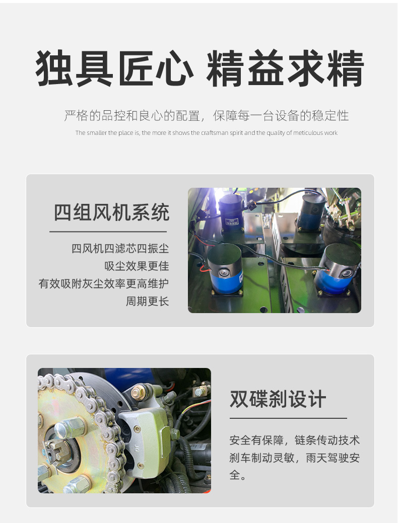 莱特LT-G50型全封闭四轮驾驶式扫地车,配备高压清洗和高压雾炮功能,清扫宽度2500mm,满电工作时间为6-8小时,工作效率25000㎡/h,采用的是8*200A免维护铅酸电池,高压雾炮射程可达10米以上,可对作业环境高效的降尘,还可以用于绿植养护和环境消杀。高压水枪可以对地面顽固污渍进行清洁,还可以冲洗路牙石,为绿植浇水,工作之余,还可以用高压水枪清洗车辆。应用场景为:厂区、车间、公园、街道、物业小区、码头、学校、机场、停车场、地下车库、充电站、加油站、公园工厂、工业园区等需要大面积清扫的区域区域。