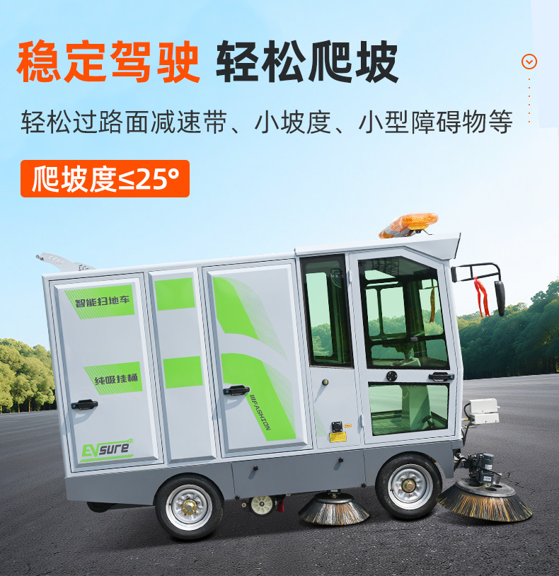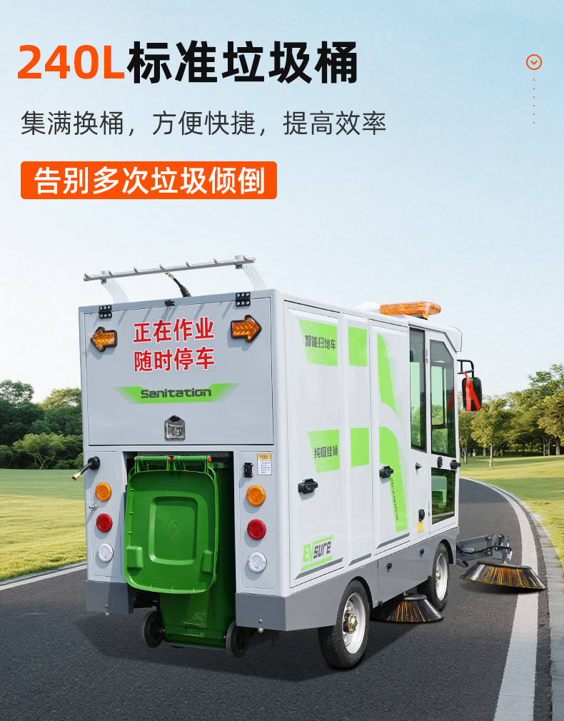 莱特LT-G86型全封闭四轮驾驶式扫地车,此车辆为纯吸款高性能车辆、无滚刷结构,使用效果更稳定。车辆具备智能语音系统,配备高压清洗和高压雾炮功能,清扫宽度2450mm,满电工作时间为3-5小时,工作效率30000㎡/h,采用的是特种车专用磷酸铁锂电池,配置长度4米可拆卸手持吸管,吸净率高,作业速度快。后置240L标准垃圾桶,收集满灰尘垃圾之后,可以直接更换垃圾桶,效率高,无需人工倾倒垃圾。高压雾炮射程可达10米以上,可对作业环境高效的降尘,还可以用于绿植养护和环境消杀。高压水枪可以对地面顽固污渍进行清洁,还可以冲洗路牙石,为绿植浇水,工作之余,还可以用高压水枪清洗车辆。应用场景为:厂区、车间、公园、街道、物业小区、码头、学校、机场等需要大面积清扫的区域区域。